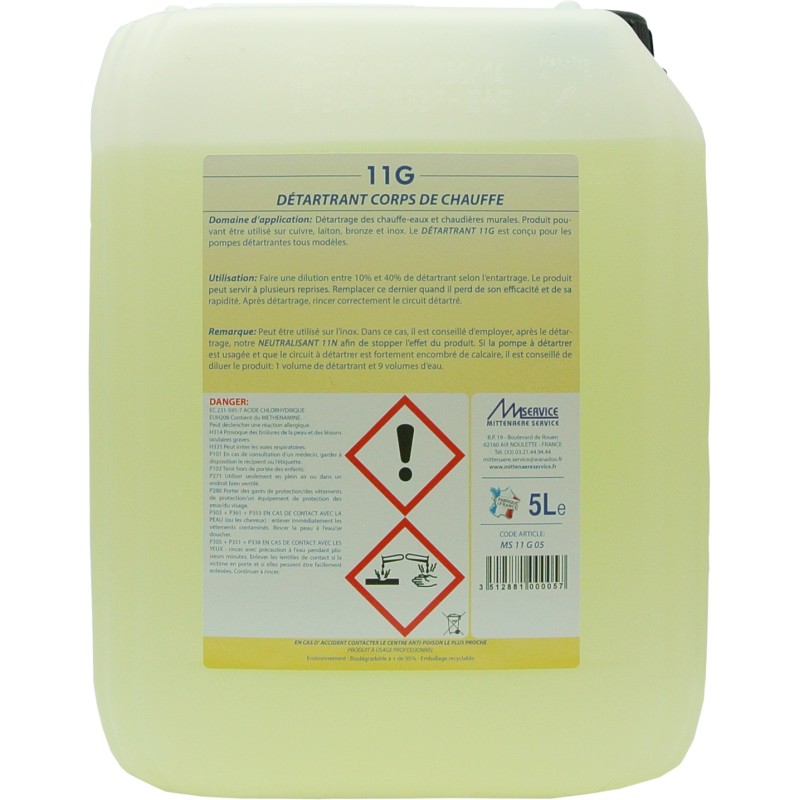 Le détartrant corps de chauffe de la marque Mittenaere Service est spécialement étudié pour le détartrage des chauffe-eaux et chaudières murales. Le 11G est conçu pour les pompes détartrantes tous modèles.